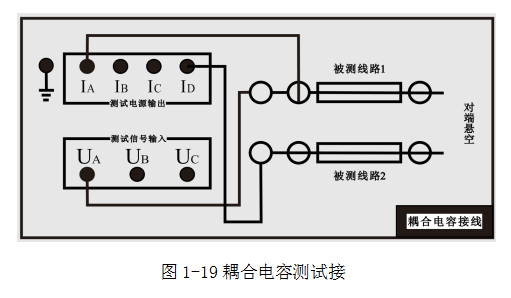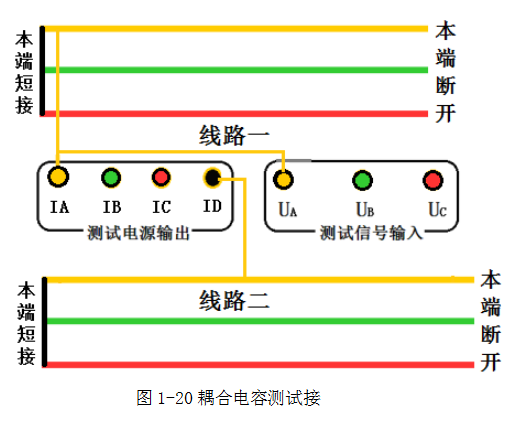 測(cè)試兩條線路間的耦合電容時(shí),被測(cè)線路1、2的測(cè)量端和對(duì)端三相分別短接,對(duì)端不接地,被測(cè)線路1的電流引下線A接至儀器輸出端,電壓引下線UA接至電壓測(cè)量端,被測(cè)線路2的首端接至UH,如圖1-19和1-20。